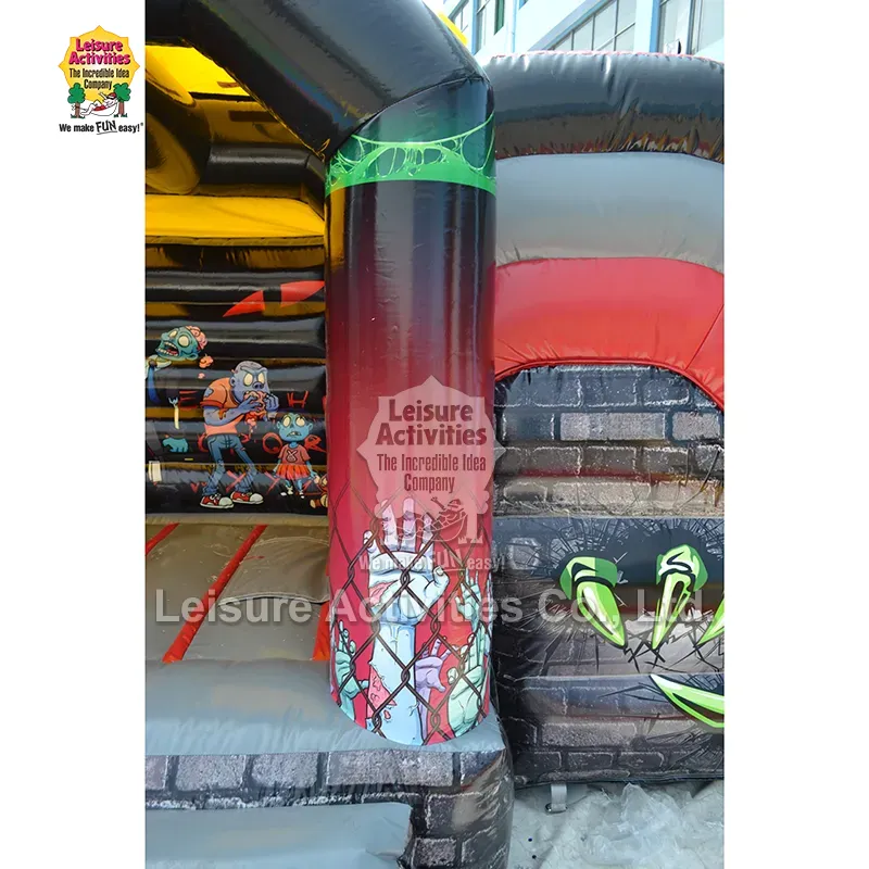 Castle Bouncy Bouncy ຂະໜາດນ້ອຍຂະໜາດນ້ອຍ Haunted with Slide: Zombiethemed "Haunted Combo" ນີ້ຖືກອອກແບບມາເພື່ອດຶງດູດເດັກນ້ອຍດ້ວຍຄວາມງາມຂອງກາຕູນ- horror ທີ່ຫນ້າຕື່ນເຕັ້ນ. ການປະສົມປະສານອັນເຂັ້ມງວດຂອງສີແດງເຂັ້ມ, ສີດຳເຫຼື້ອມ, ແລະສີຂຽວ ແລະສີຟ້າທີ່ແປກປະຫຼາດຈະສ້າງສະພາບແວດລ້ອມທີ່ສົດໃສ, ຕື່ນເຕັ້ນ. ຮູບກາຟິກທີ່ໜ້າຮັກຂອງກາຕູນ zombies ຂະໜາດໃຫຍ່ໃນການຕັ້ງຕົວແບບເຄື່ອນໄຫວ ເຊັ່ນ: ພະຍາບານ, ຕົວລະຄອນທີ່ກິນສະໝອງ ແລະ ເດັກນ້ອຍ zombie ທີ່ມີໂຕຫມີ-ແມ່ນມ່ວນກວ່າທີ່ໜ້າຢ້ານກົວ. ອົງປະກອບແບບໂຕ້ຕອບ ເຊັ່ນ: ຜີດິບສີຟ້າຂະໜາດໃຫຍ່ທີ່ກວາດຢູ່ເທິງຫຼັງຄາ, ມືທີ່ຕົບຕາໄຫຼຜ່ານຝາ, ແລະຕ່ອງໂສ້/ກາຟິກຢູ່ເທິງຖັນເຮັດໃຫ້ເກີດການຫຼິ້ນຈິນຕະນາການ. ໂຄງສ້າງທີ່ປິດລ້ອມດ້ວຍຜ້າຄຸມດ້ານເທິງປົກປ້ອງໃຫ້ຮົ່ມແລະຝົນອ່ອນໆ, ໃນຂະນະທີ່ສະໄລ້ປິດລ້ອມຈະເພີ່ມການຜະຈົນໄພ. ຄວາມສູງ 10ft ເຮັດໃຫ້ມັນຫລາກຫລາຍສໍາລັບການນໍາໃຊ້ທັງໃນເຮືອນແລະກາງແຈ້ງ, ເຫມາະຢ່າງສົມບູນກັບງານລ້ຽງ Halloween, ງານບຸນລະດູໃບໄມ້ປົ່ງ, ເຫດການວັນເກີດທີ່ມີຫົວຂໍ້, ແລະການມ່ວນຊື່ນໃນສວນຫລັງບ້ານ.