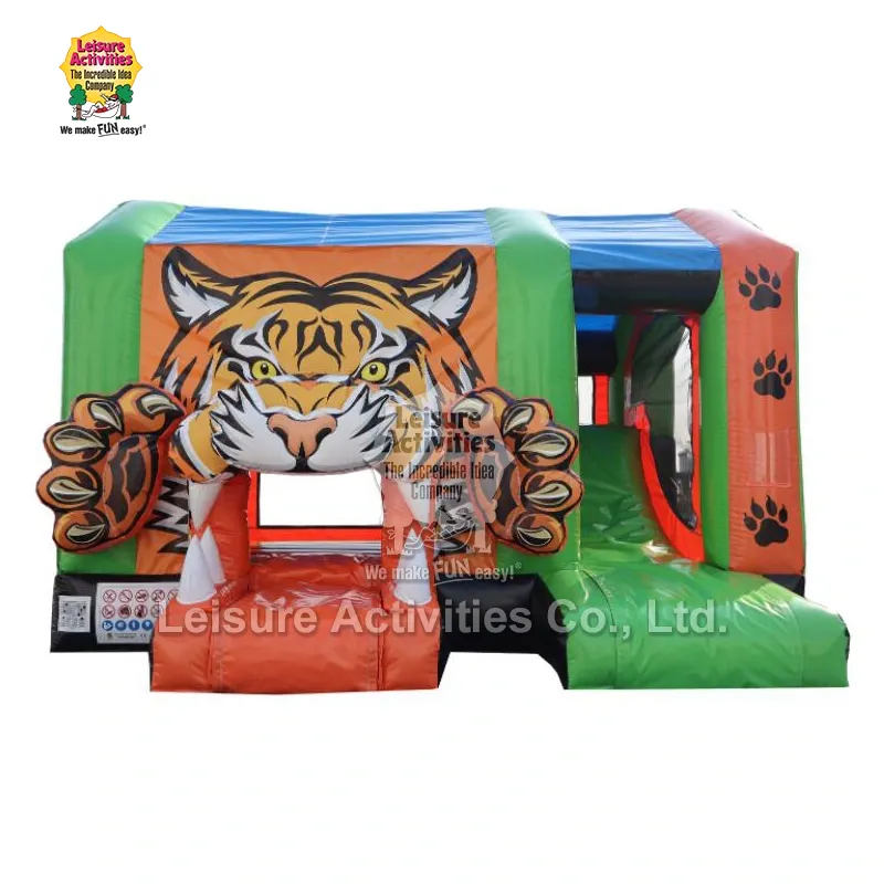 Leisure Activities®ເປັນຜູ້ຜະລິດມືອາຊີບແລະຜູ້ສະຫນອງຜະລິດຕະພັນອັດຕາເງິນເຟີ້ໃນປະເທດຈີນ. Standard Inflatable Multiplay Tiger Bouncy Castles ເປັນ Castle ອັດຕາເງິນເຟີ້ແບບເສືອທີ່ປະສົມປະສານລັກສະນະການໂດດ, ປີນຂຶ້ນ ແລະເລື່ອນ. ມັນມີສີຂຽວປູນຂາວ ແລະສີສົ້ມເປັນສີຫຼັກ, ມີການຕົບແຕ່ງຮູບເສືອ 3D ຢູ່ທາງເຂົ້າ. ມັນສາມາດຕັ້ງຄ່າໄດ້ໄວໃນເວລາພຽງ 10 ນາທີ.